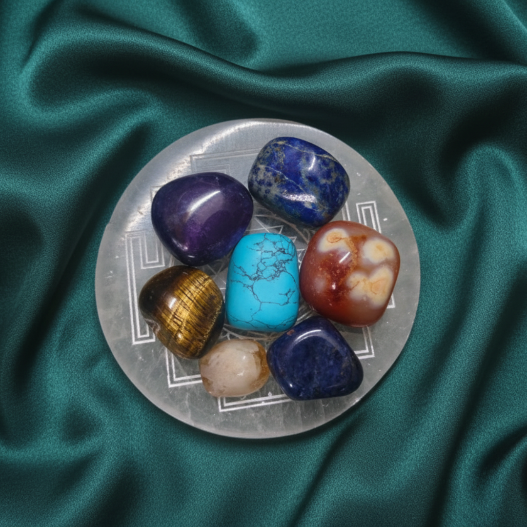 - Place crystals, bracelets or malas on the plate for 4–8 hours or overnight to cleanse and recharge.