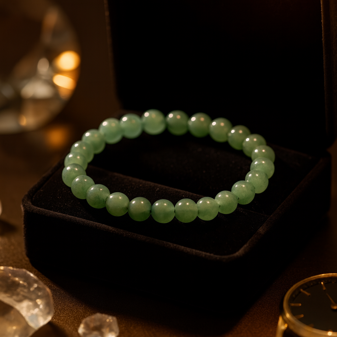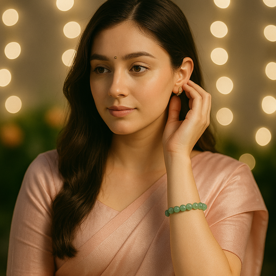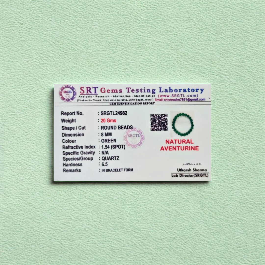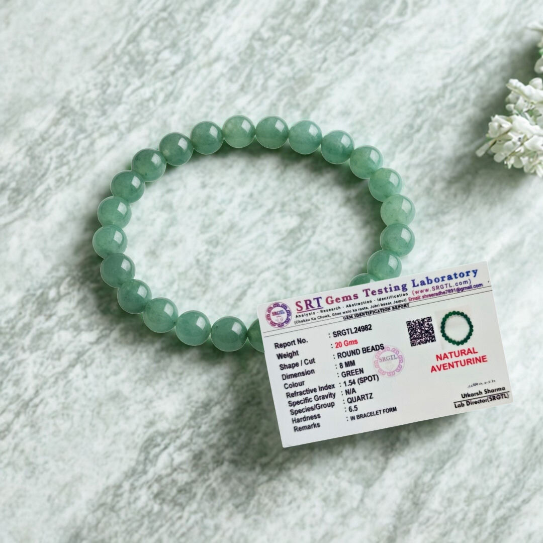 வாய்ப்பின் கல் என்று அழைக்கப்படும் பச்சை அவென்டுரைன் வெற்றி, நல்ல அதிர்ஷ்டம் மற்றும் நிலையான வளர்ச்சியுடன் தொடர்புடையது. எங்கள் AAA தர வளையல் கைவினைப்பொருளாக வடிவமைக்கப்பட்டு, வேத மந்திரங்களால் உற்சாகப்படுத்தப்பட்டு, மிகுதியாகவும் நம்பிக்கையுடனும் முடிவெடுப்பதை ஆதரிக்கிறது.