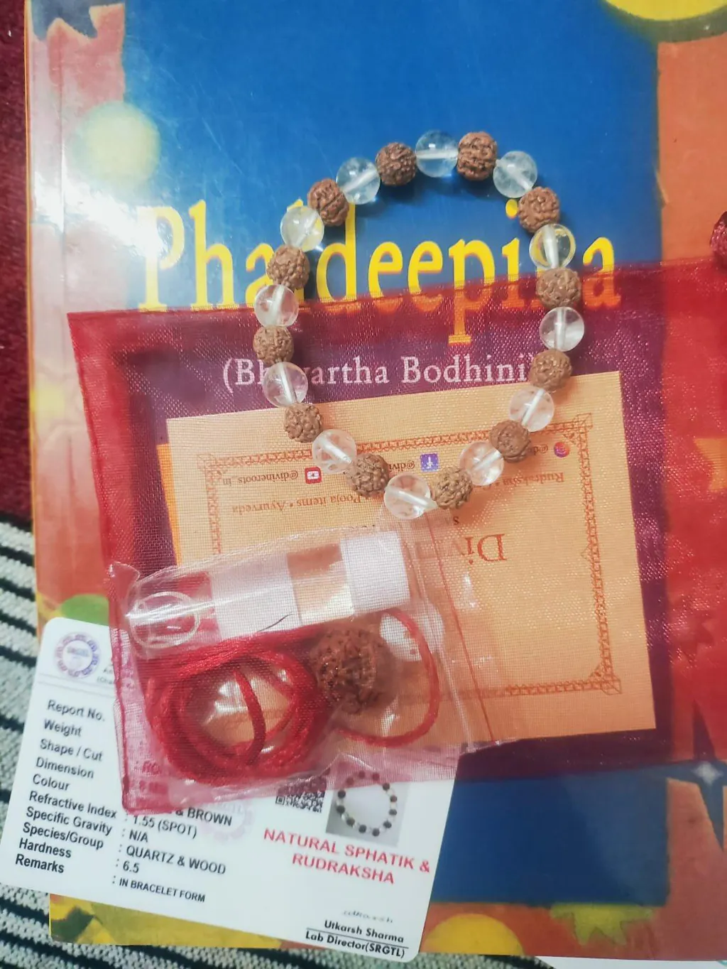 - Materials: Natural Sphatik (Crystal Quartz) & Rudraksha
